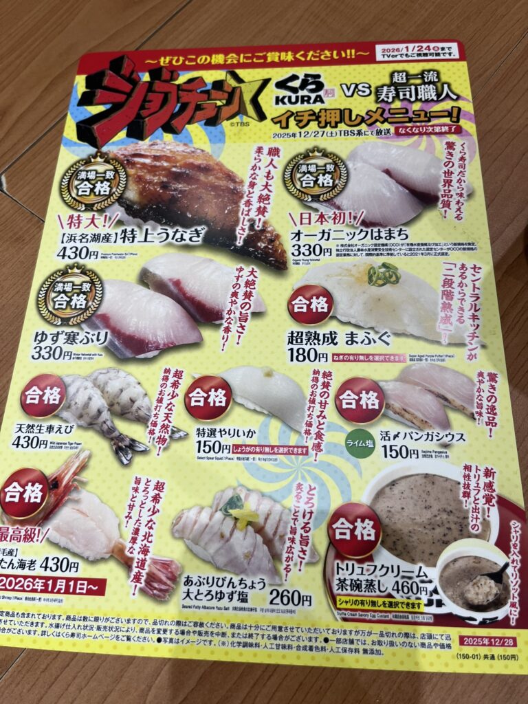 今回は12月27日に放映されたバラエティー番組「ジョブチューン」で放映された「くら寿司VS超一流寿司職人」の企画を見て、番組で放映されたお寿司が食べたくなり、実際に「くら寿司」に食べに行ってきました。