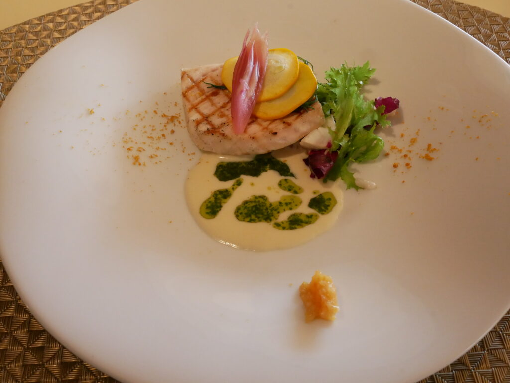 メインは選択できました。こちらはメカジキのグリリアータ 大麦のインサラータグレモラータです。